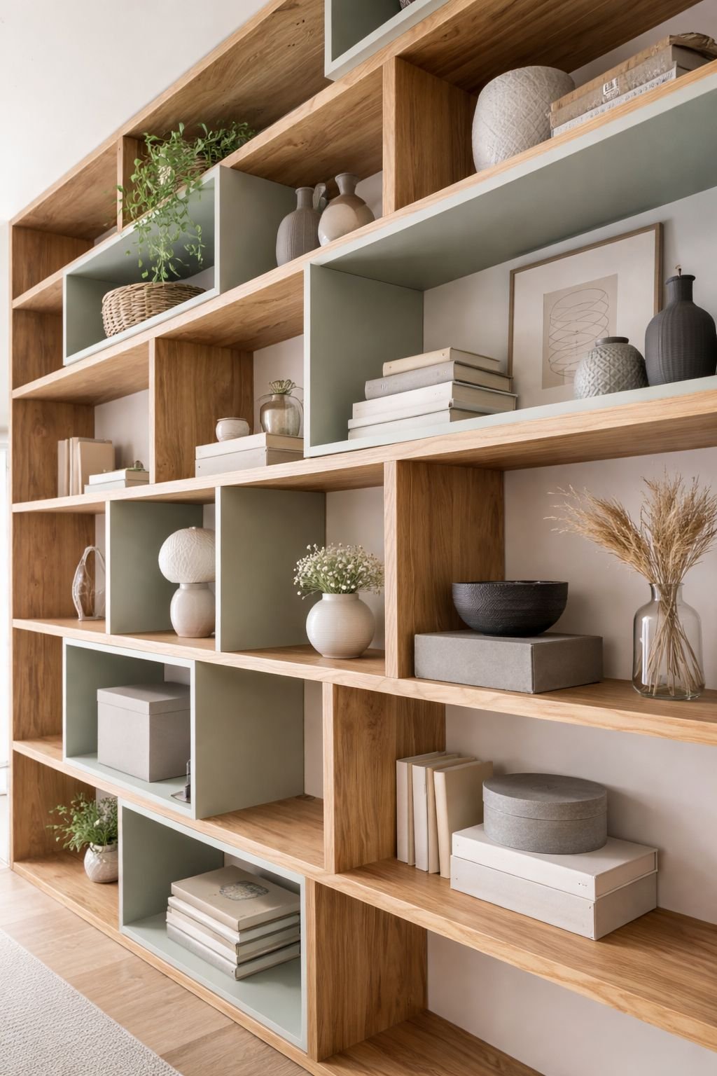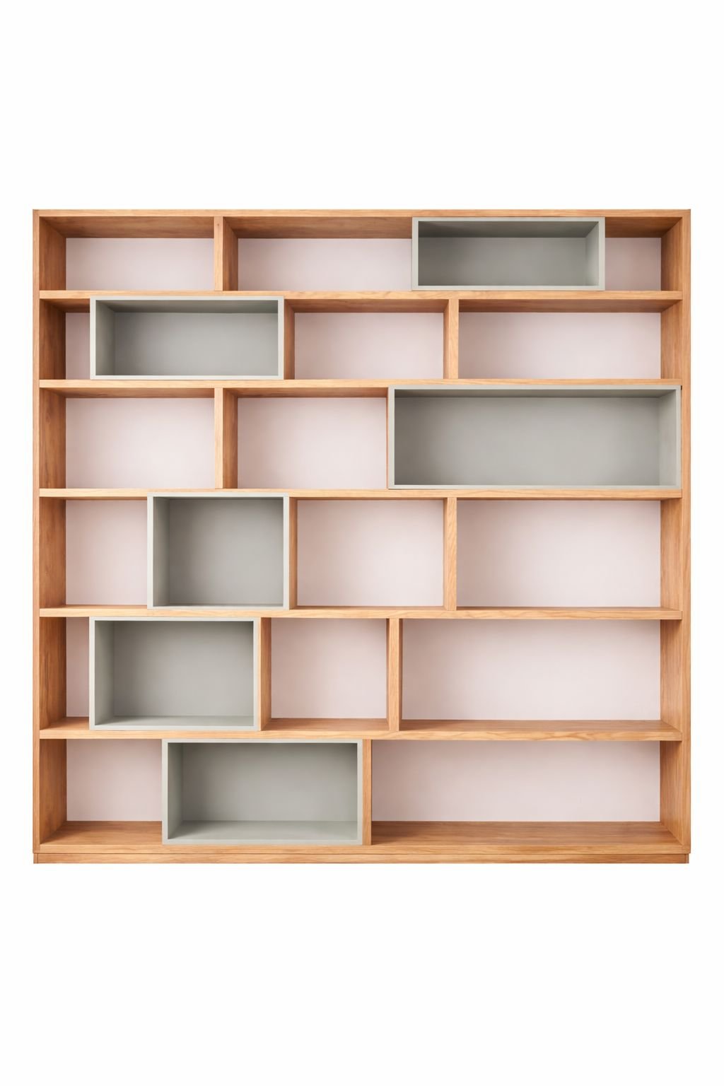 Maatwerk modulaire boekenkast in warm licht eikenhout met verschillende vakverhoudingen en subtiele gekleurde achterpanelen voor een zachter decoratief ritme.