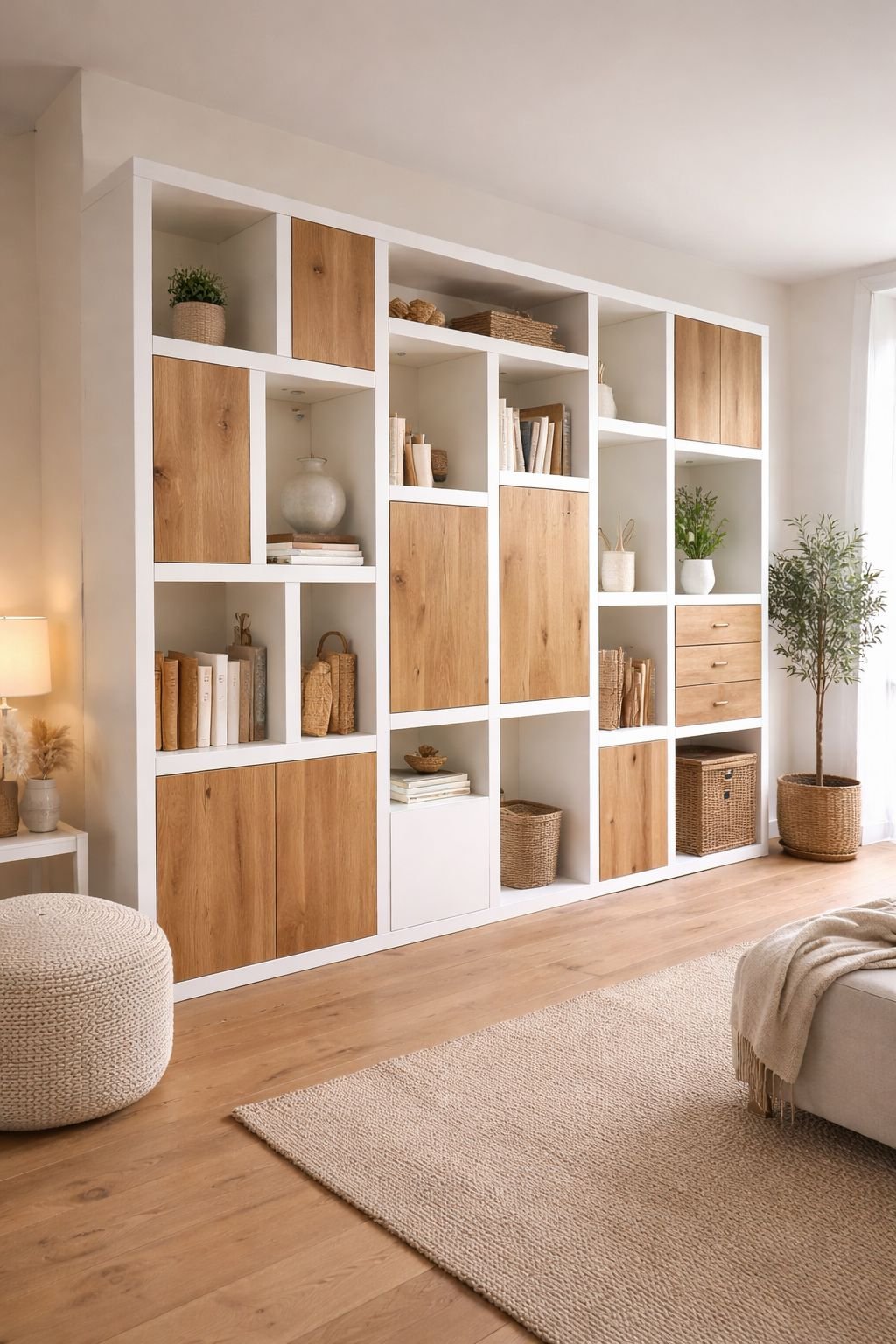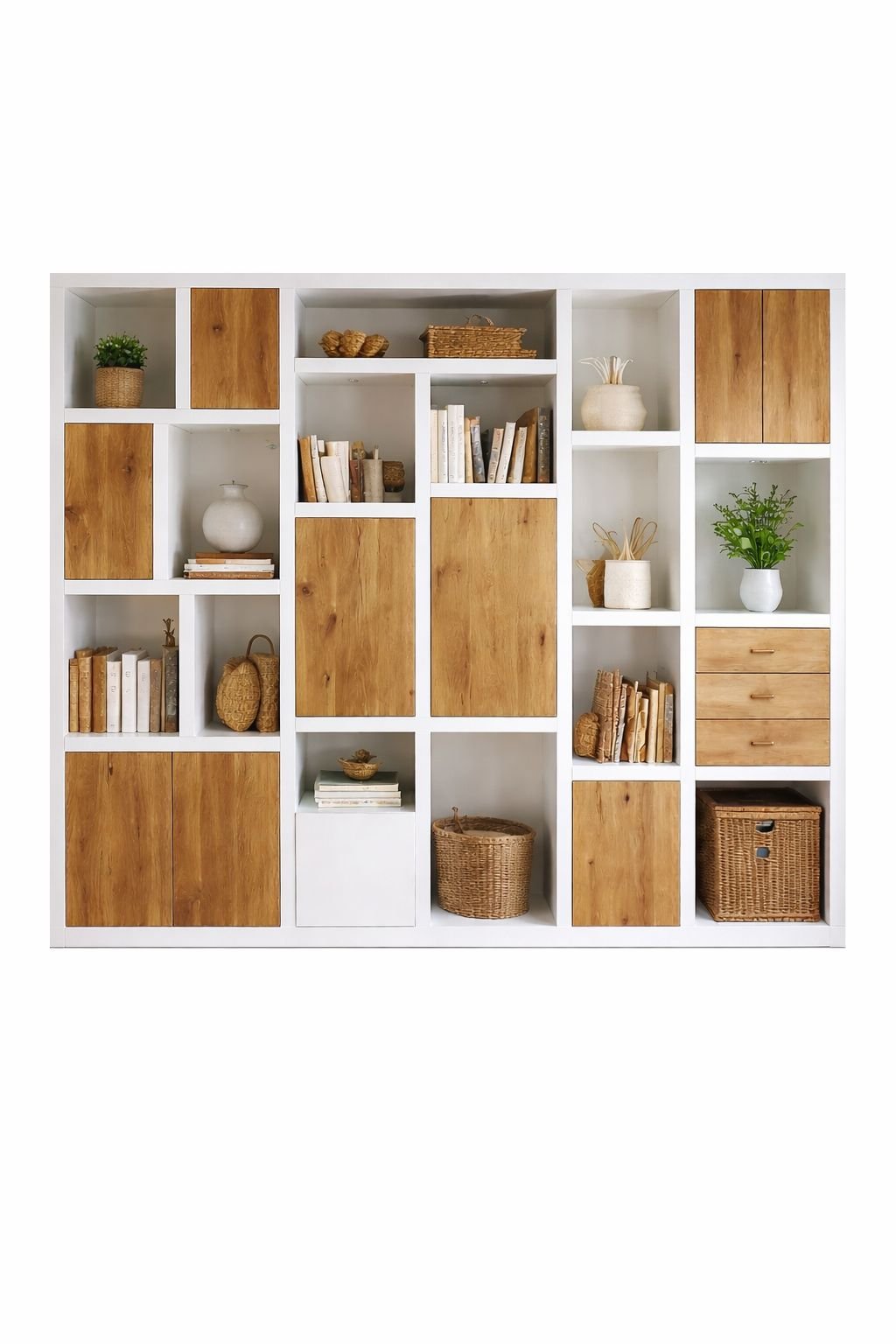 Heldere modulaire wandkast die open displayvakken combineert met gesloten eiken opbergruimte en geïntegreerde laden.