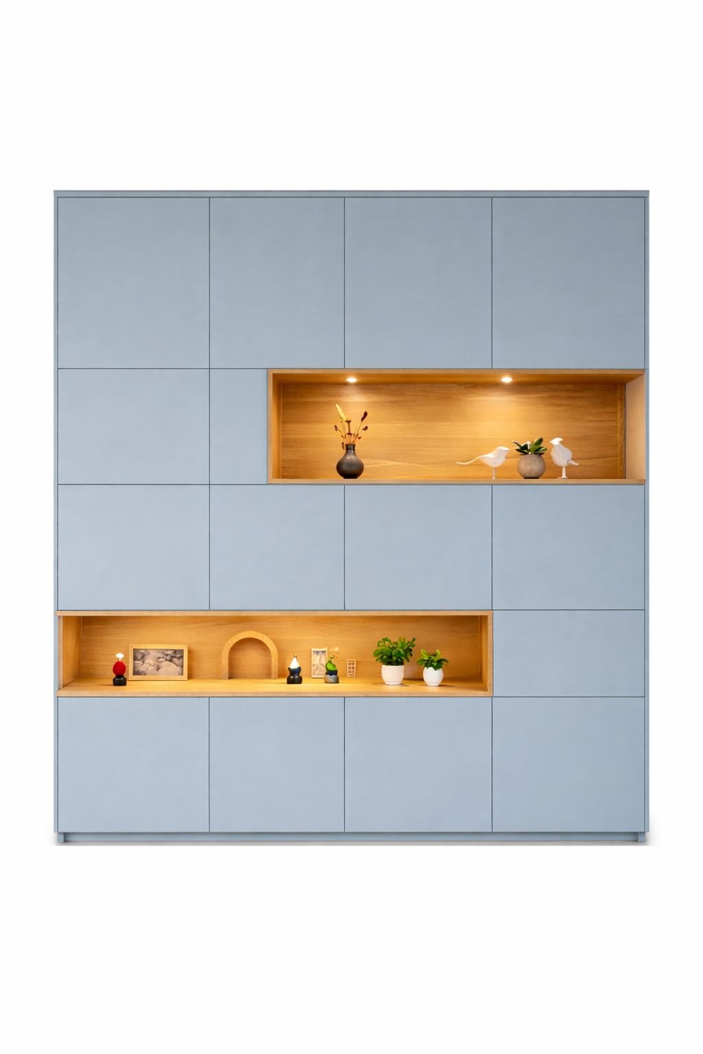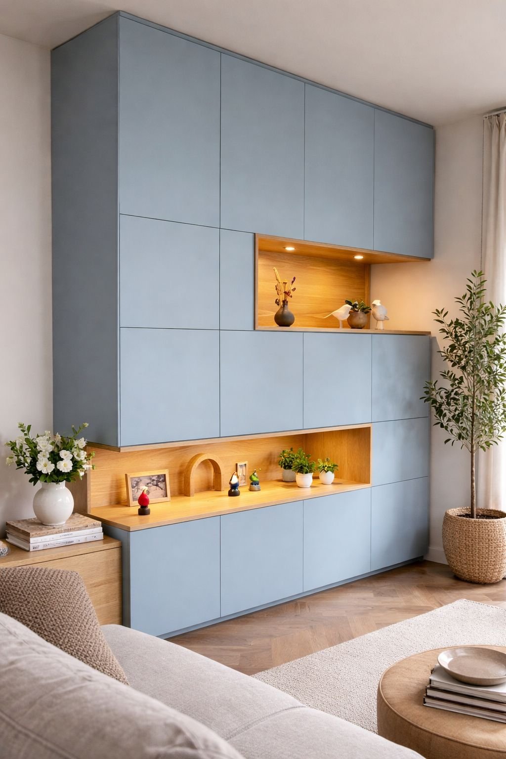 Elegante ingebouwde kastenwand met rustige blauwe afwerking, warme eiken accenten en geïntegreerde verlichting voor decoratieve objecten.
