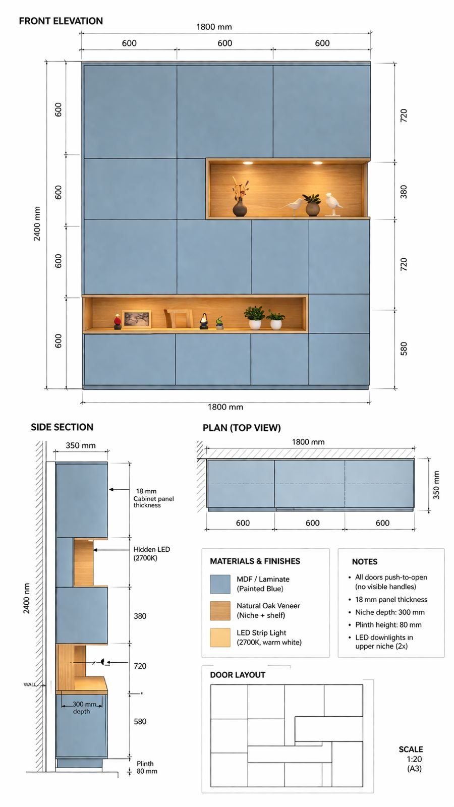 - Mat stofblauw met natuurlijk eiken in de open nissen