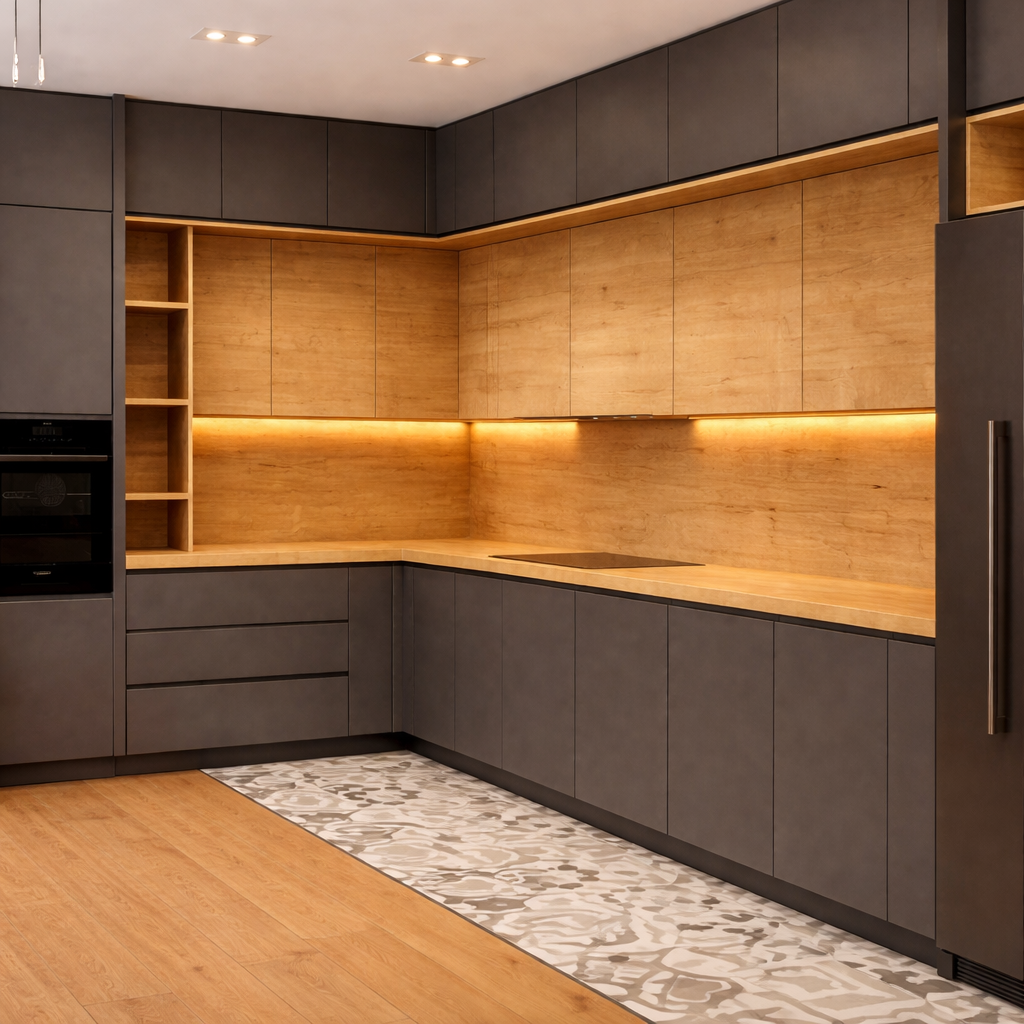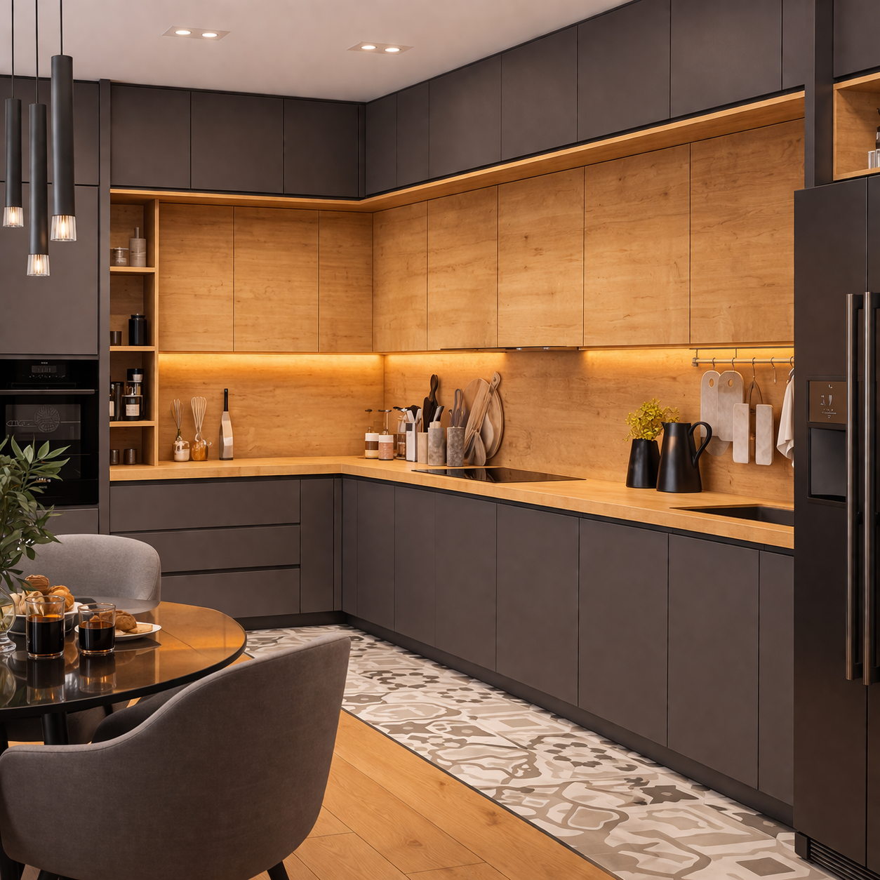 Elegante maatkeuken met warme houtafwerking, strakke verticale verhoudingen en een naadloze moderne indeling.