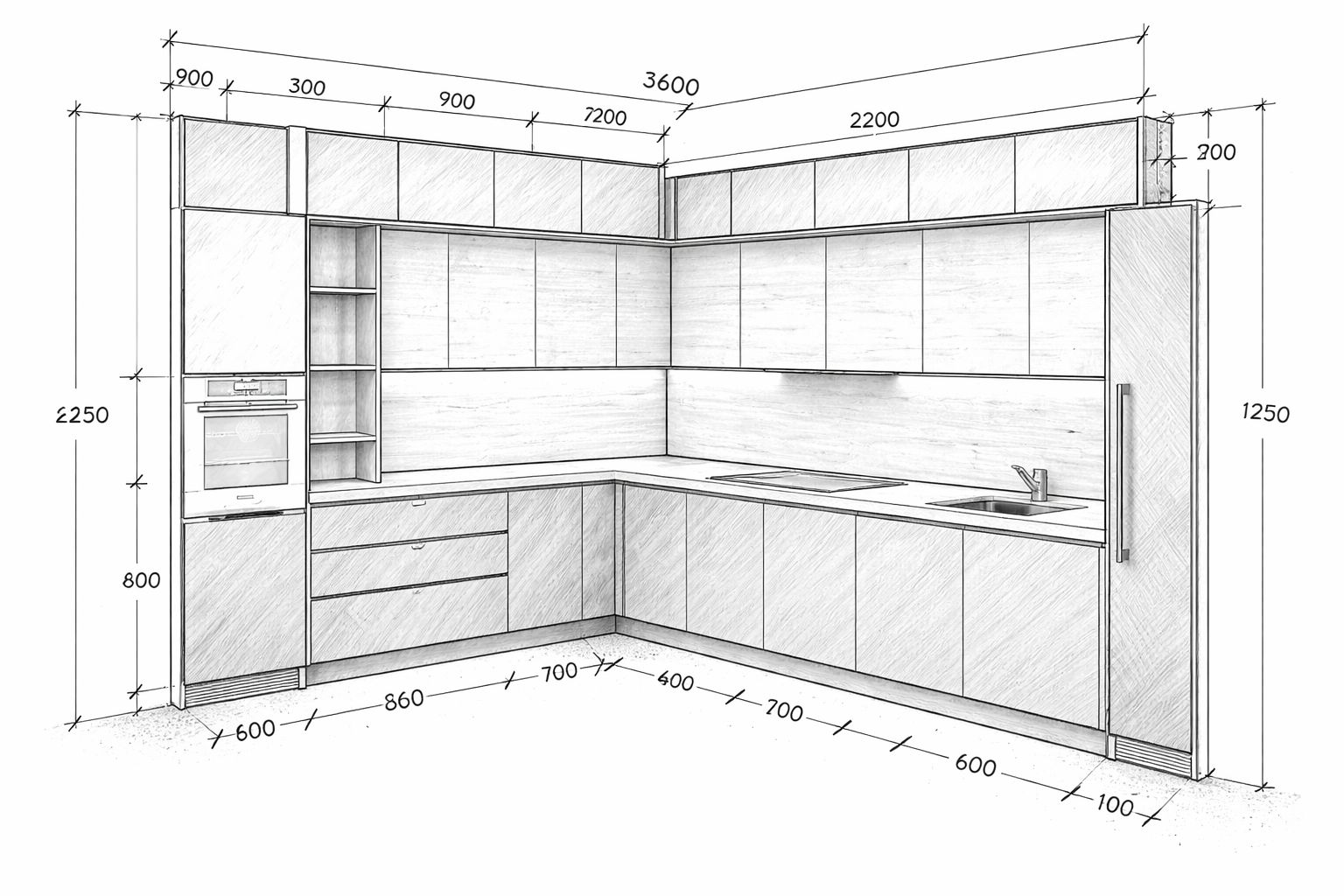 - Lineaire keukencompositie met hoge opbergkasten en geïntegreerde basiskasten
