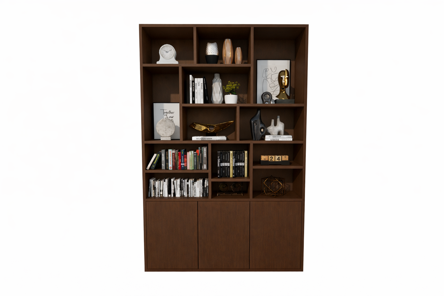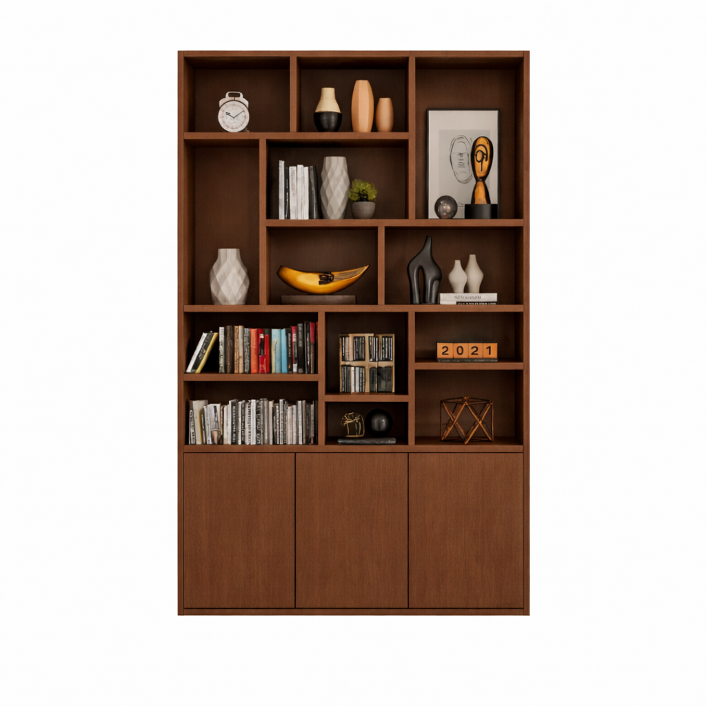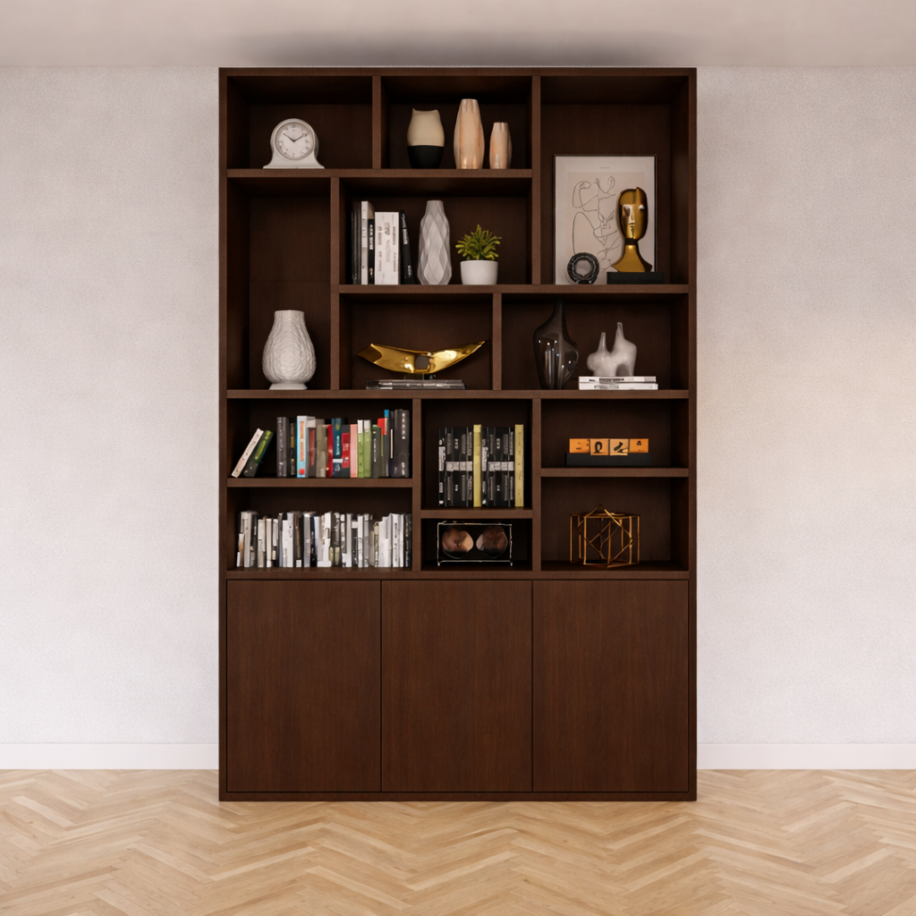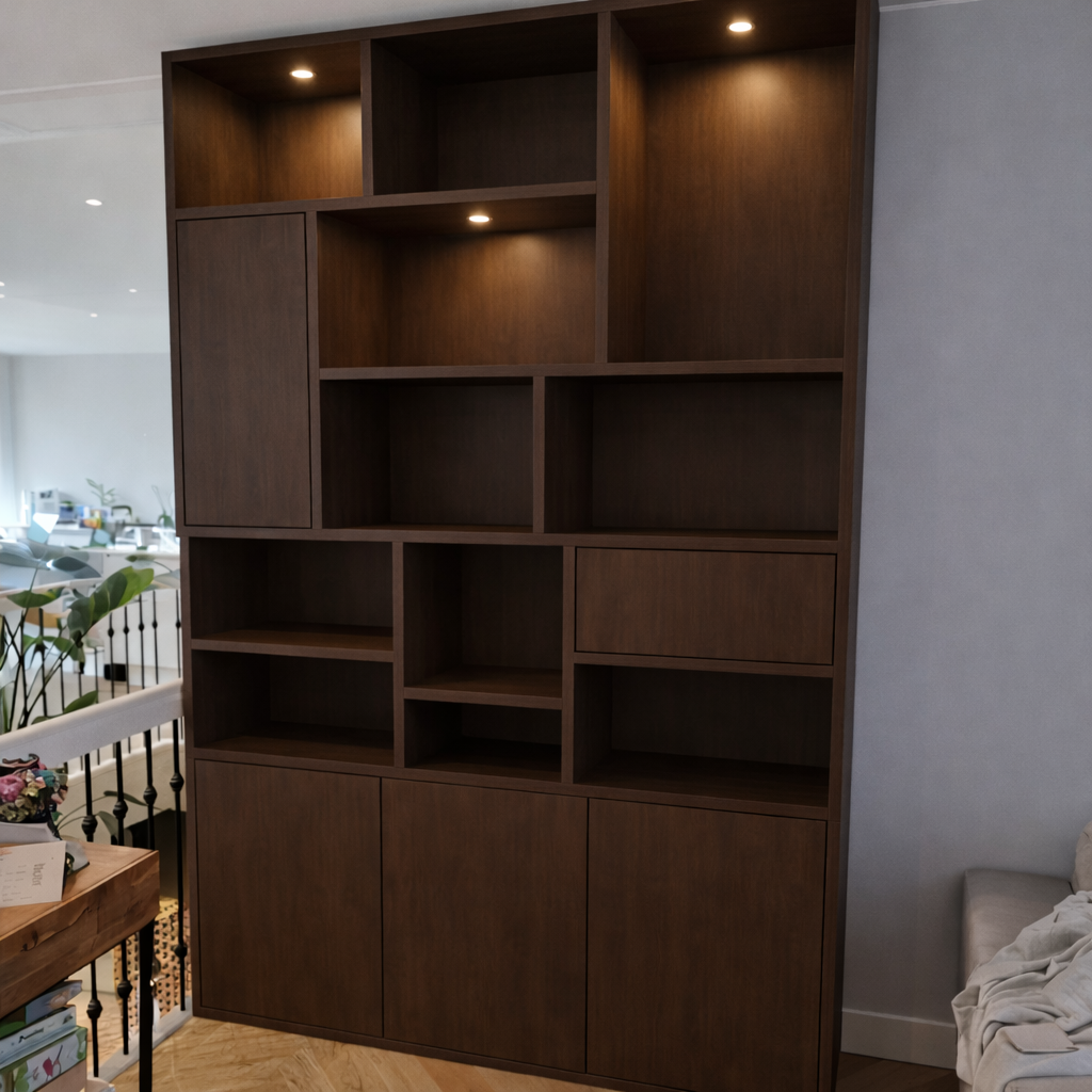 Zoals op de foto: rijke walnootlook met verschillende open vakken voor boeken en objecten, geïntegreerde ledaccenten bovenaan en een gesloten onderkast.