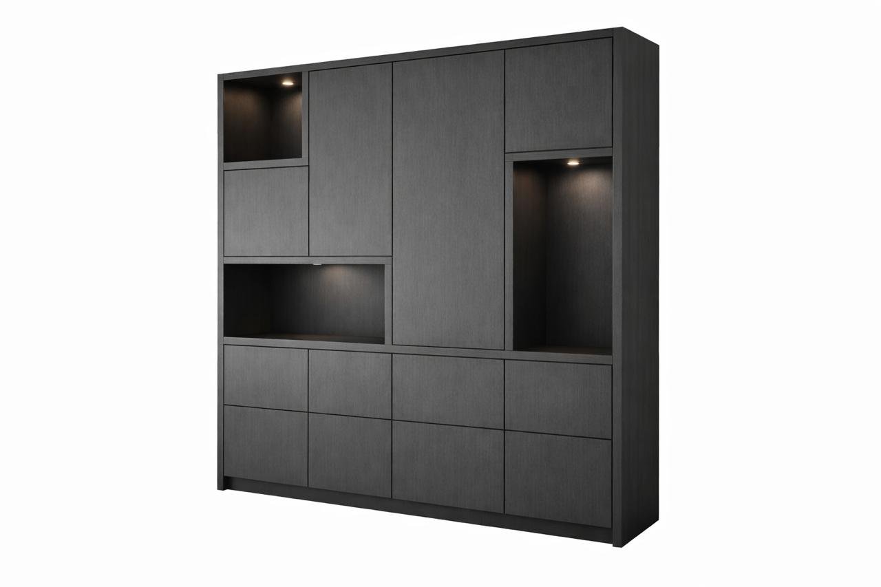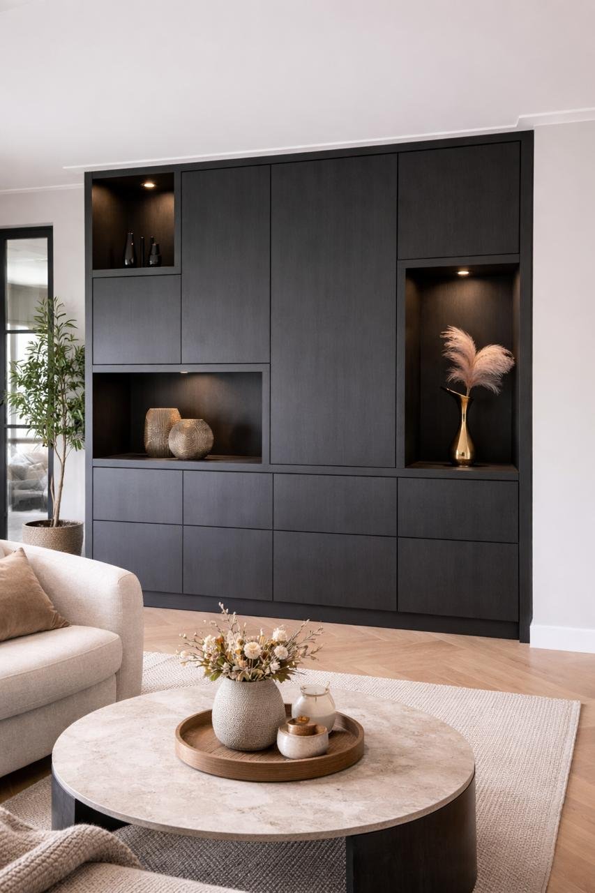 Zoals getoond: push-to-open fronten, horizontale ladestapels en decoratieve nissen voor vazen en objecten.